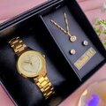 Características: com caixa dourada e pulseira aço, este produto acompanha uma gargatilha e um par de brincos (acessório/brinde sujeito a alteração).
