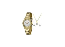 Características: com caixa dourada e pulseira em aço, este produto acompanha uma gargantilha e um par de brincos (acessório/brinde sujeito a alteração).