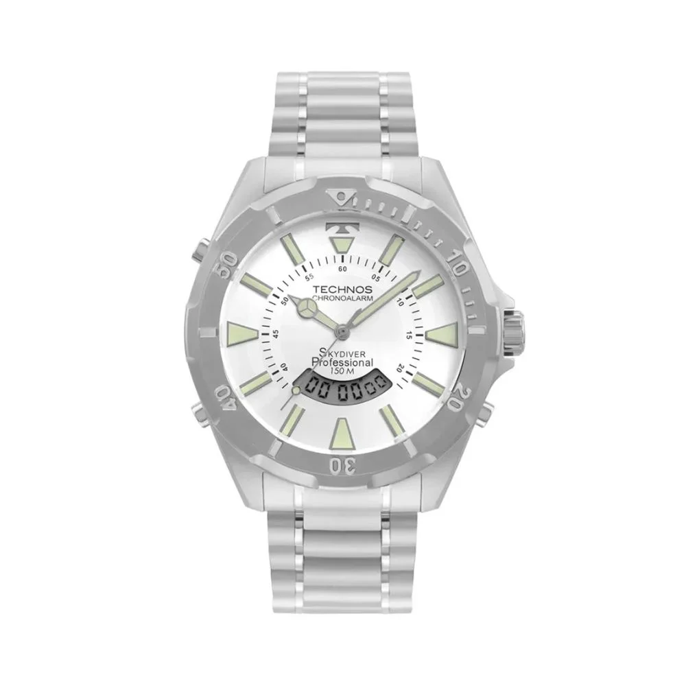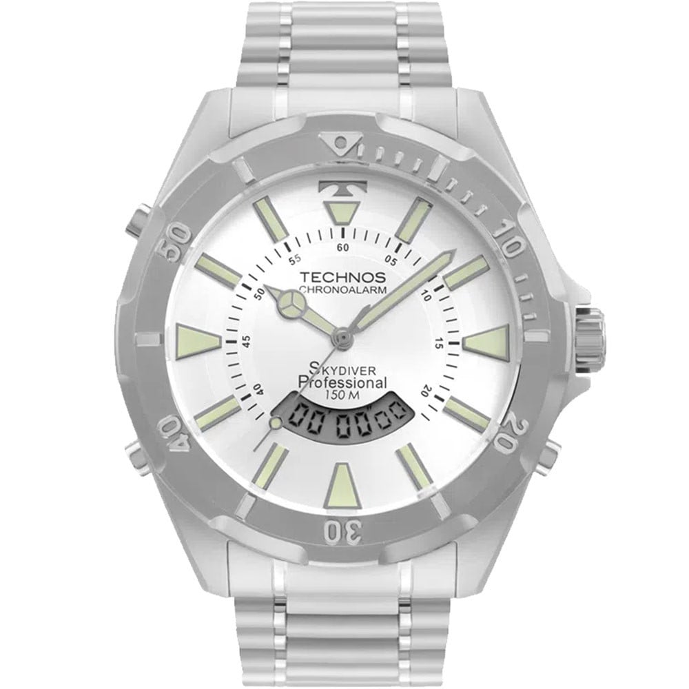 O Relógio Masculino Technos Skydiver WT205FY/1B traz força e versatilidade para o pulso masculino. A caixa de 48?mm em aço inox prata abriga um sistema anadigi (analógico + digital) que oferece cronógrafo, cronômetro com contagem progressiva e regressiva, alarme, calendário, formato 12/24?h e catraca unidirecional exclusiva .