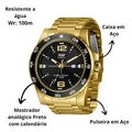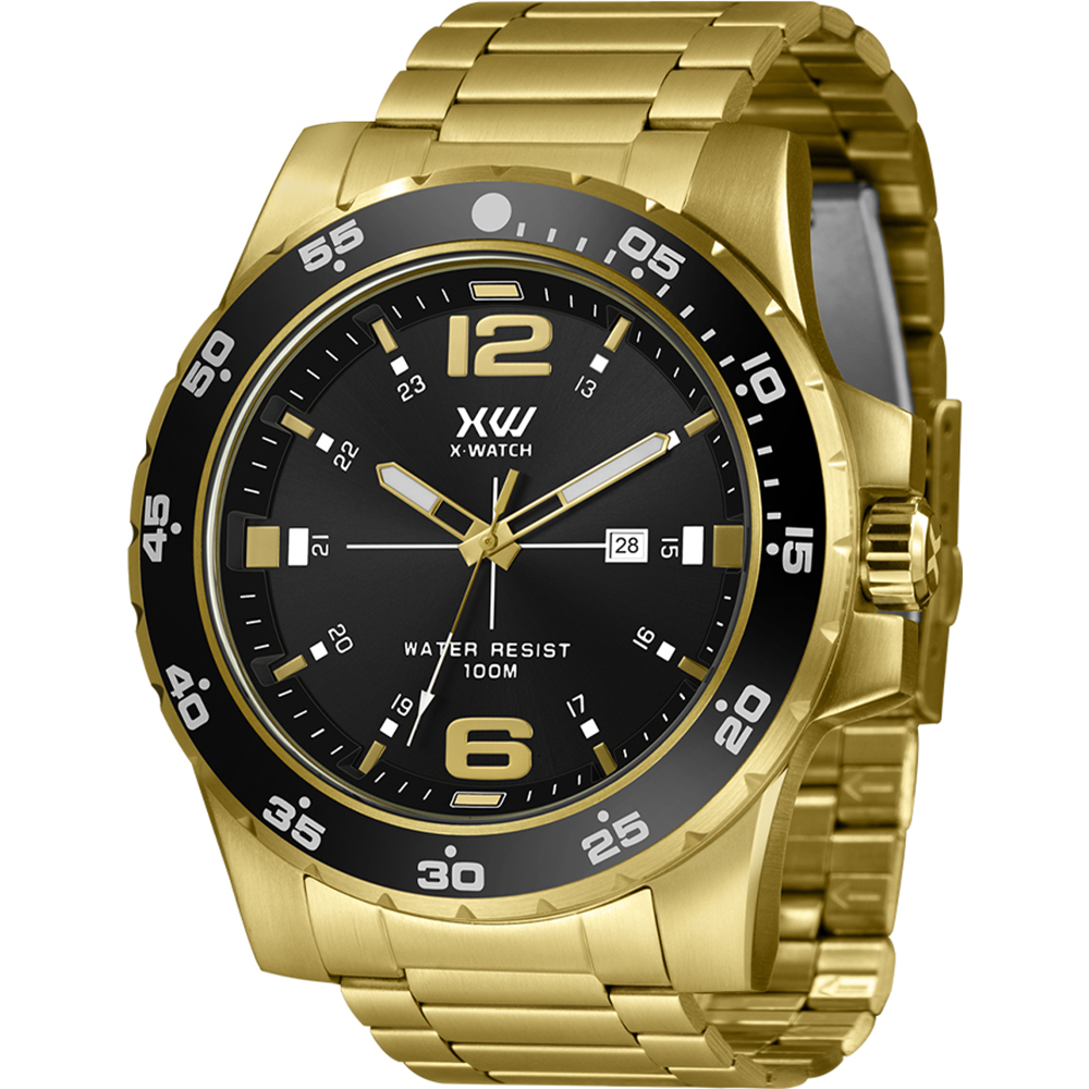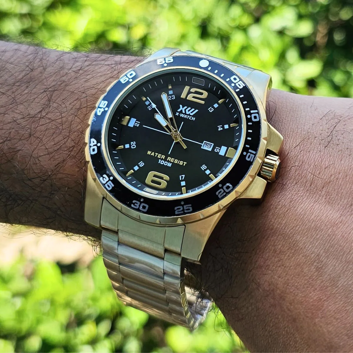 Relógio de pulso masculino x watch, modelo P2KX, com caixa fabricada em aço inoxidável dourado, mostrador com fundo preto de alta visibilidade, ponteiros e marcadores dourados, movimento quartz confiável, visor analógico, função de calendário embutida, vidro em cristal mineral, pulseira metálica dourada com fecho dobrável de segurança, resistente à água, ideal para uso diário e ocasiões formais, combina estilo moderno com elegância clássica, oferecendo durabilidade, precisão e sofisticação no pulso.
