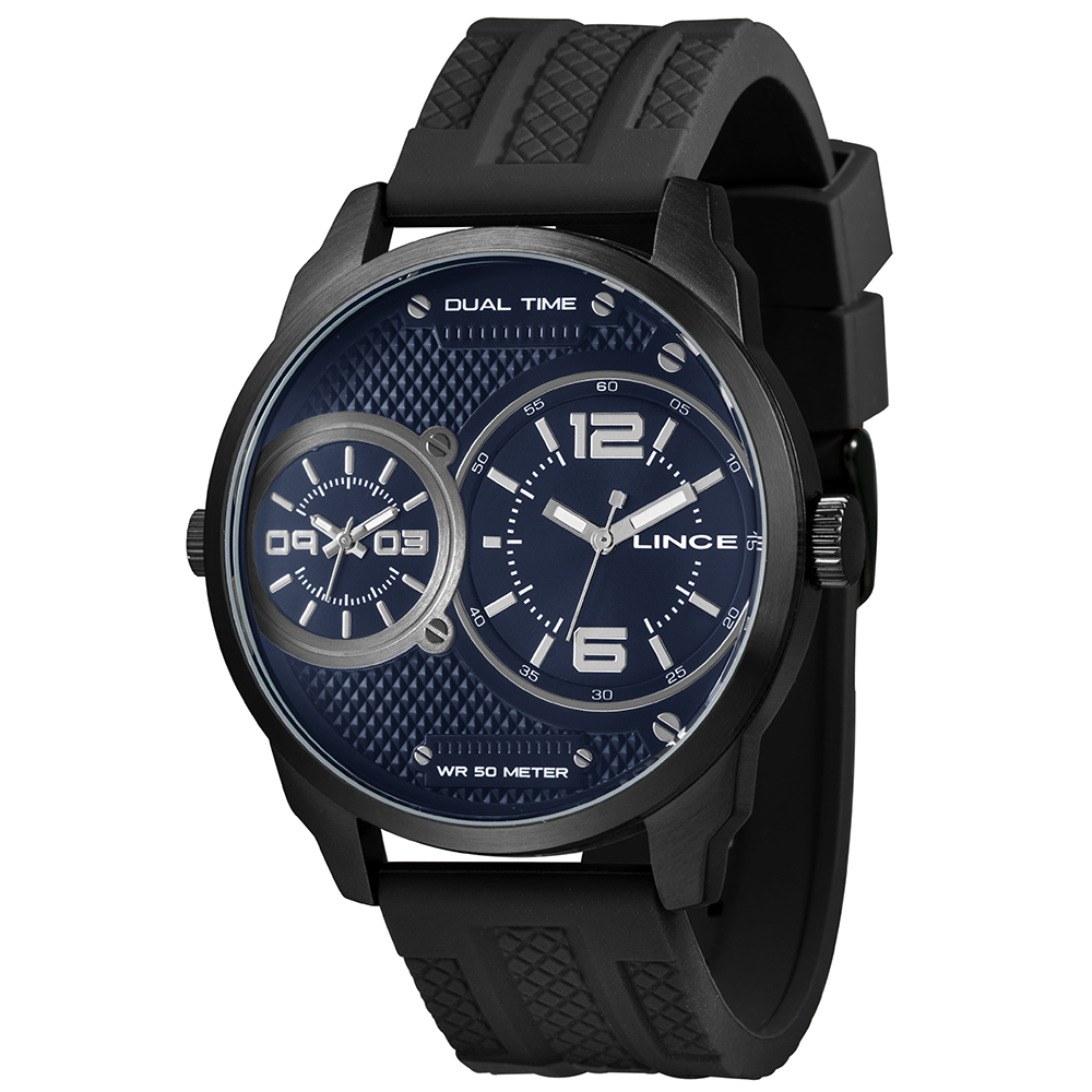 Relógio de pulso masculino Lince, modelo D2PX, com caixa fabricada em aço resistente e acabamento escovado, mostrador com fundo azul de alta visibilidade, ponteiros e marcadores metálicos, movimento quartz confiável, visor analógico, função de calendário embutida, vidro em cristal mineral, pulseira metálica com fecho dobrável de segurança, resistente à água, ideal para uso diário e ocasiões formais, combina estilo moderno com elegância clássica, oferecendo durabilidade, precisão e sofisticação no pulso.