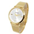 ? Design Luxuoso: caixa e pulseira tipo esteira em aço inoxidável dourado com mostrador perolado – puro charme e sofisticação.