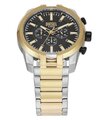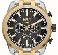 Relógio de pulso masculino Diesel, modelo DZ4625, com caixa robusta em aço inoxidável misto (prata e dourado), mostrador com fundo cinza escovado, ponteiros e marcadores dourados, movimento quartz confiável, visor analógico com função cronógrafo, resistente à água até 5 ATM, vidro em cristal mineral, pulseira metálica com fecho dobrável de segurança, ideal para uso diário e ocasiões especiais, combina estilo moderno com sofisticação, oferecendo durabilidade, precisão e elegância no pulso