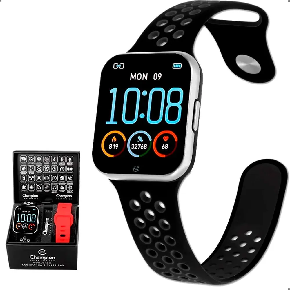 O Smartwatch Champion CH50033T é o parceiro ideal para o seu dia a dia: com design moderno, funcionalidade completa e monitoramento avançado de saúde. Sua caixa retangular (37,8?×?43,5?×?11?mm) em alumínio preto com aro prata com display Full Touch de 1,72″ (240?×?286) proporciona elegância e usabilidade.