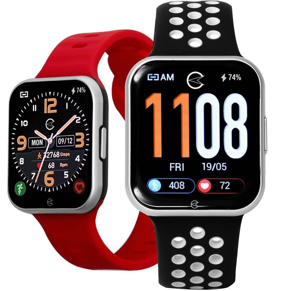 Inclui duas pulseiras de silicone (preta/prata e vermelha), ideais para diferentes estilos ou momentos. Com certificação IP68 contra água e poeira, suporta chuva, piscina e uso intenso.