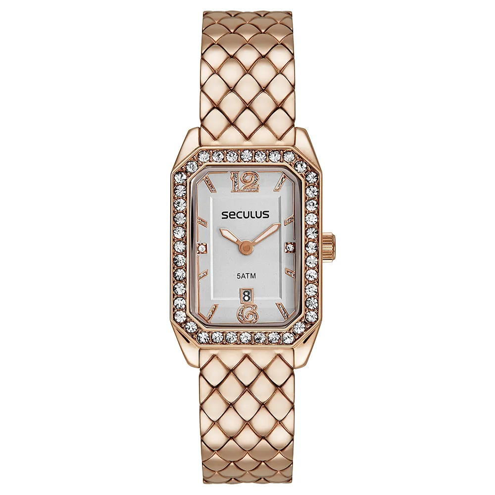 O Relógio Feminino Seculus 23711LPSVRB2 combina estilo contemporâneo e sofisticação discreta. Com caixa quadrada de 23×36?mm em aço rosé e mostrador texturizado acentuado por cristais no aro, este modelo apresenta design clean e elegante. A pulseira sofisticada e o acabamento polido tornam-no um acessório versátil, ideal para complementar produções do dia a dia e eventos especiais.
