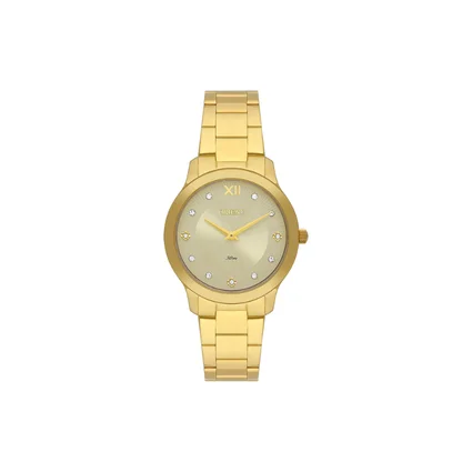 O Relógio Feminino Orient Eternal FGSS0225 traz a elegância atemporal em forma de acessório sofisticado. Com caixa de 32?mm em aço inox banhado a dourado (IPG) e pulseira delicada, destaca-se pelo mostrador tipo sunray com texturas geométricas e aplicação de cristais austríacos em marcadores, conferindo brilho refinado e exclusividade.