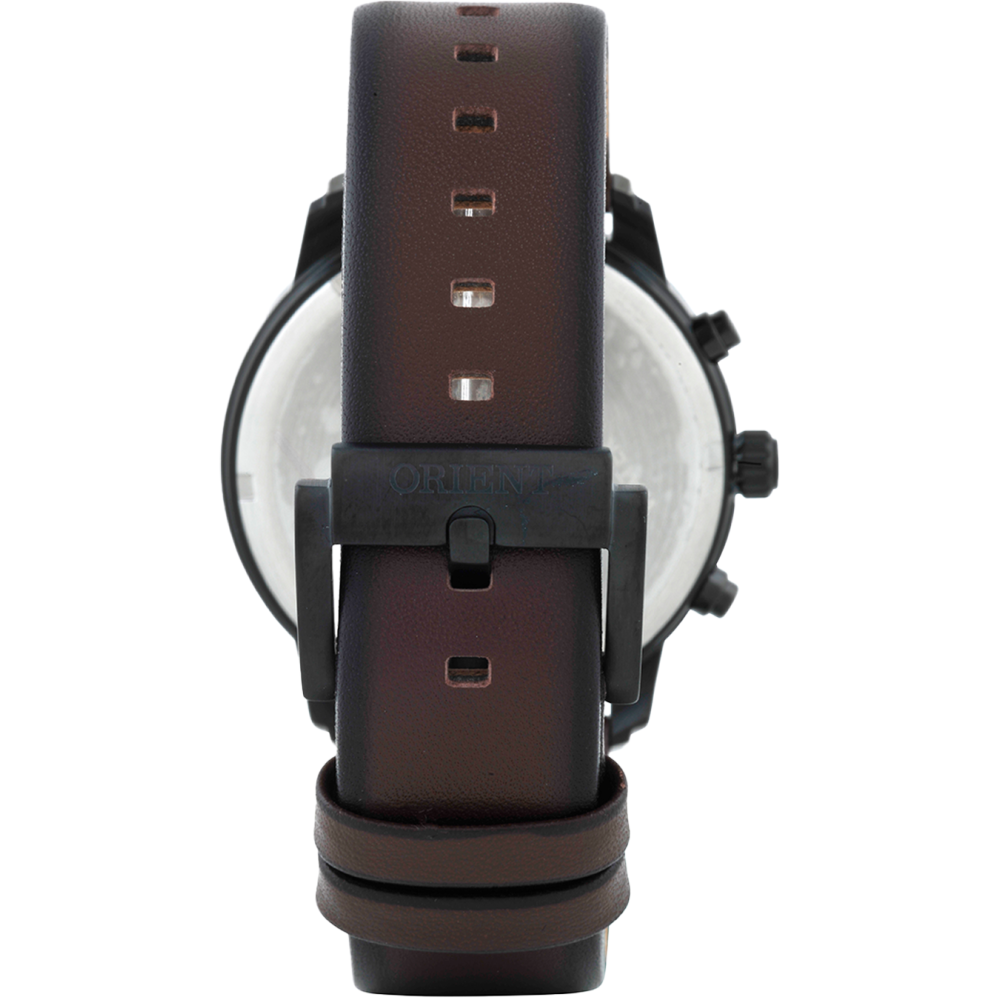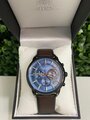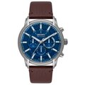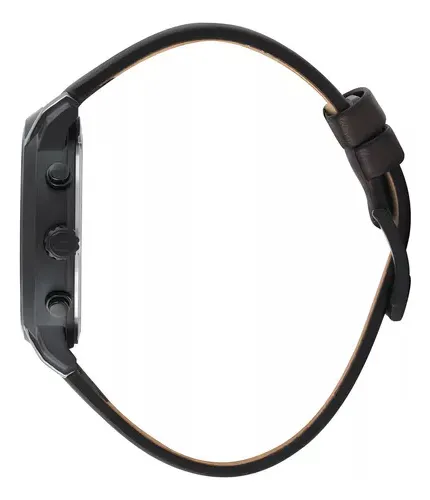 Sua caixa é em aço e sua pulseira em couro marrom, seu vidro é de cristal mineral e possui mostrador azul. Seu funcionamento é Analógico.
