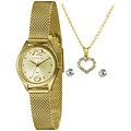 Características: com caixa dourada e pulseira em aço tipo mesh, este produto acompanha uma gargantilha e um par de brincos (acessório/brinde sujeito a alteração).